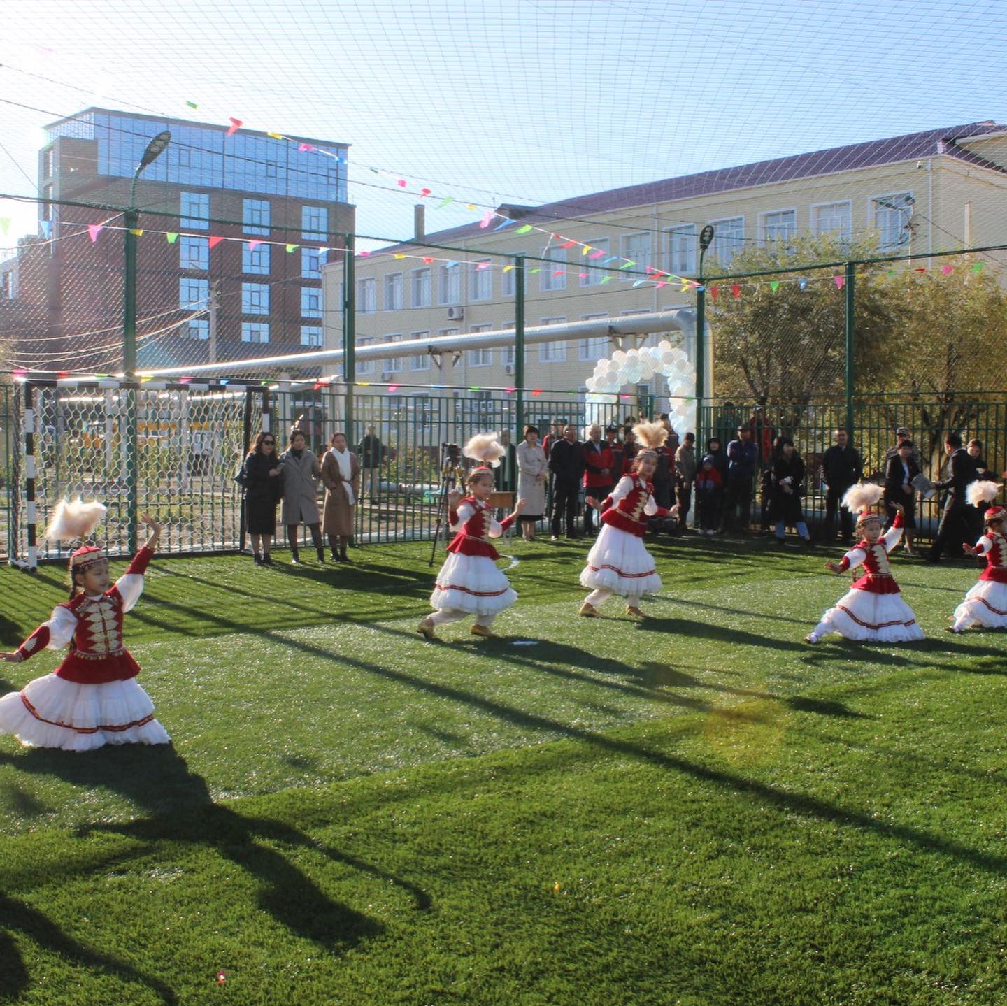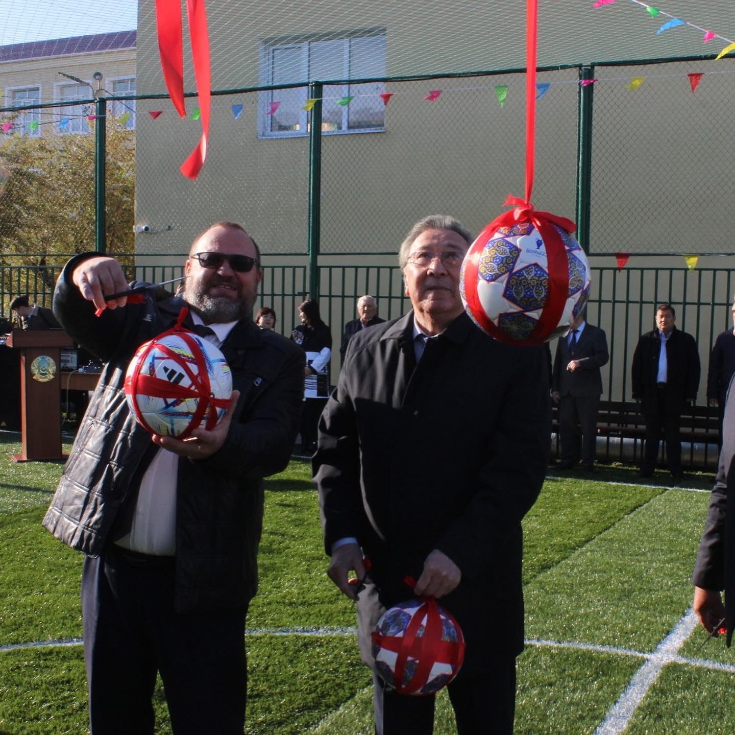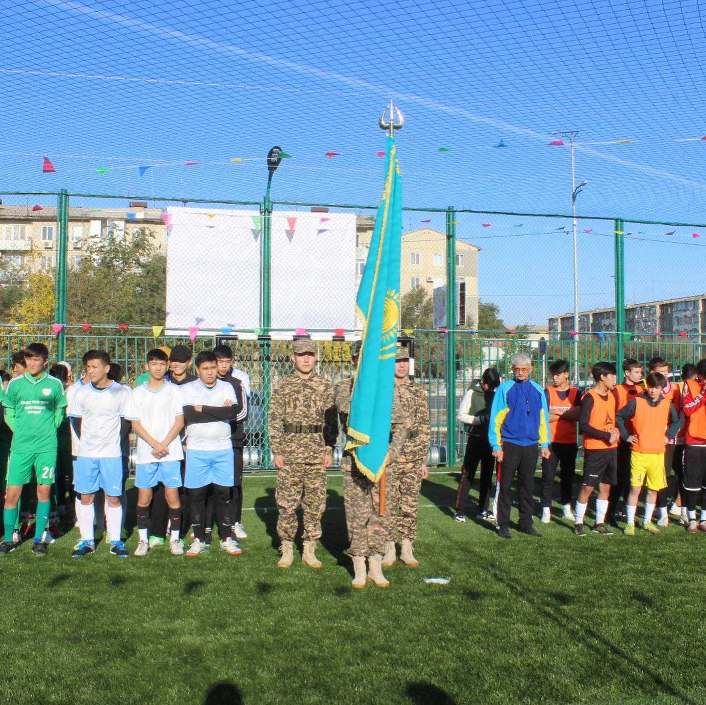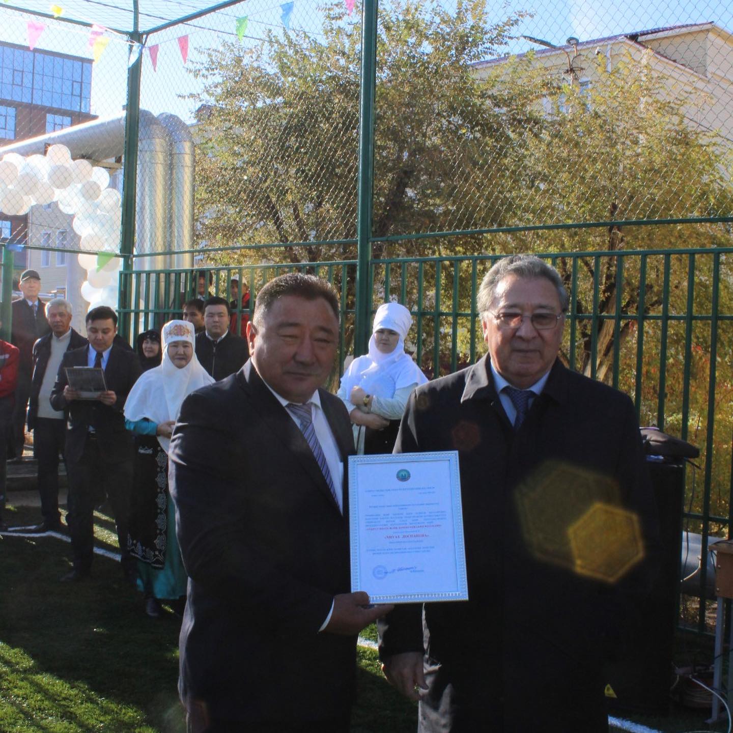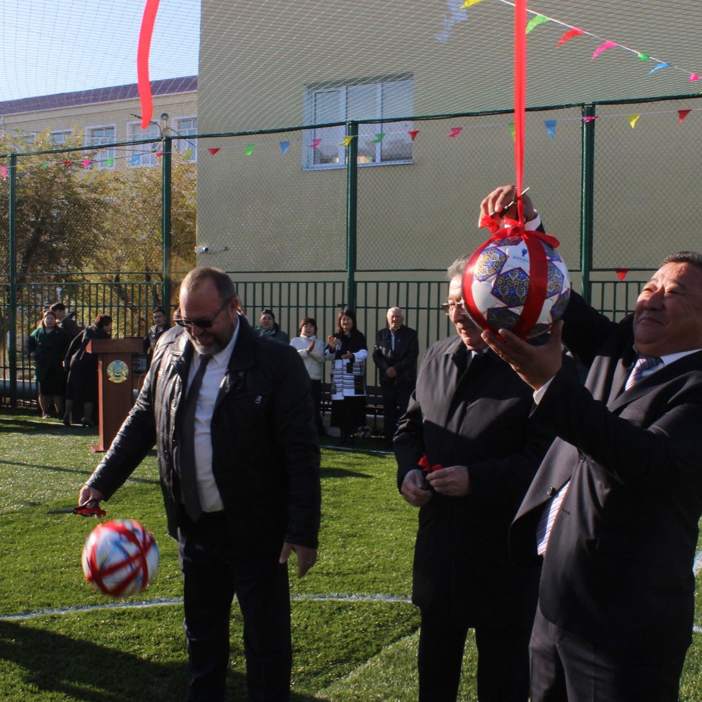 Көптен күткен тарихи сәт – спорт алаңының салтанатты лента қию рәсімі болды. Оған облыстық Ардагерлер Кеңесінің төрағасы Мұрат Сақтайұлы, әлеуметтік серіктес «Колизей» Жауапкершілігі Шектеулі Серіктестігінің бас директоры Андрей Александрович, колледж директоры, техника ғылымдарының кандидаты, доцент Ниталиев Жанбек Қорғанбайұлы қатысты.