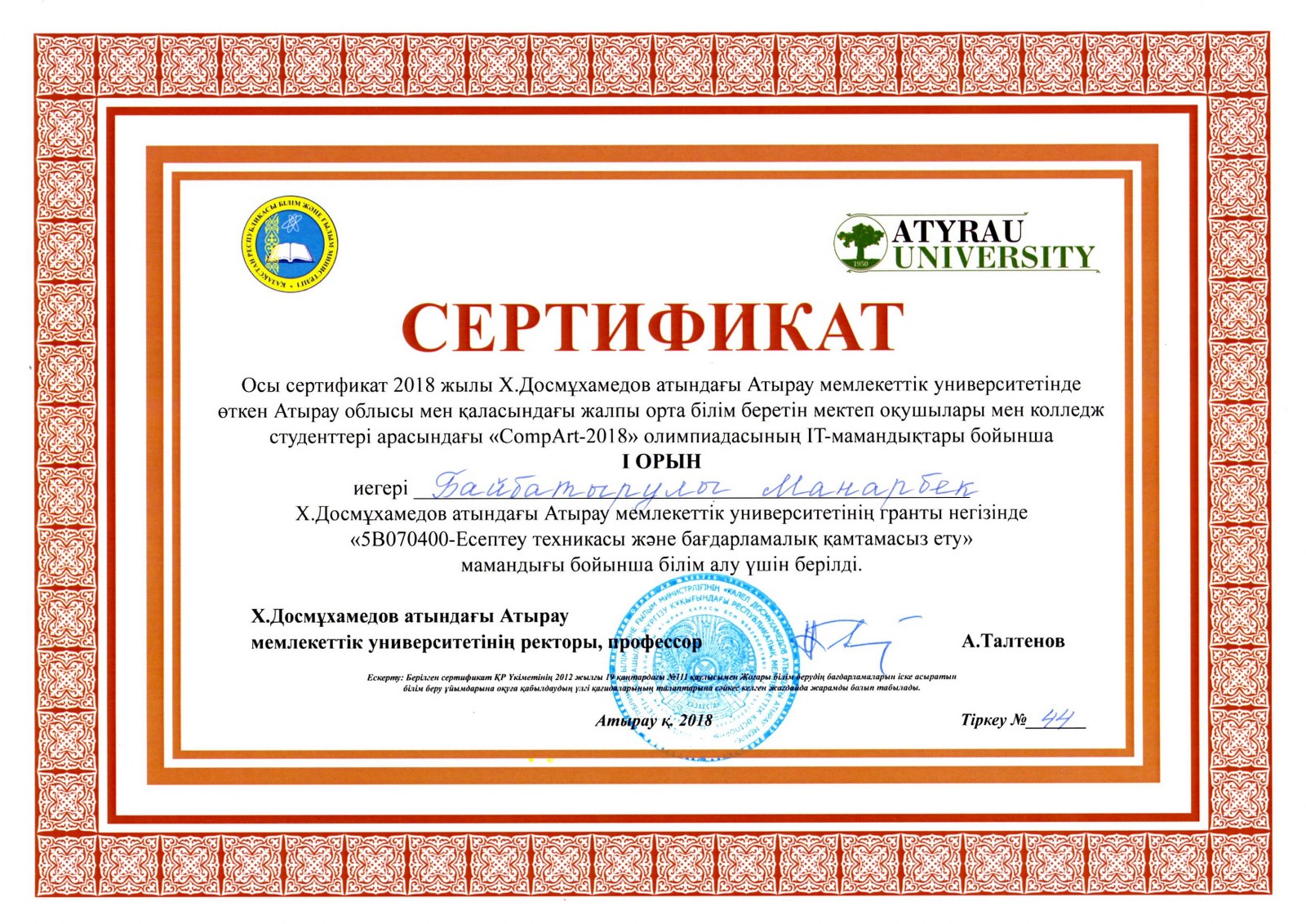 Х.Досмұхамедов атындағы Атырау мемлекеттік университетінде өткен Атырау облысы мен қаласындағы жалпы орта білім беретін мектеп оқушылары мен студенттері арасындағы "CompART-2018" олимпиадасына колледж командасы қатынасып жүлделі І-орын алып, ІТ-мамандықтары бойынша Байбатырұлы Манарбек Х.Досмұхамедов атындағы Атырау мемлекеттік университетінің ректоры грантын жеңіп алды.