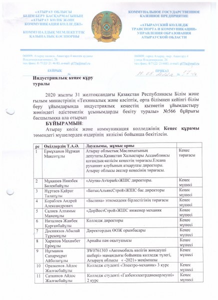 13/05/(2022) күні Атырау көлік және коммуникация колледжі базасында, 2020 жылғы 31-желтоқсан ҚР Білім және ғылым министрінің "Техникалық және кәсіптік, орта білімнен кейінгі білім беру ұйымдарында индустриялық кеңестің қызметін ұйымдастыру жөніндегі әдістемелік ұсынымдарды бекіту туралы №566 бұйрығы негізінде колледжде Индустриялық кеңес құрылып, 4 құзіреттілік орталығының ашылу салтанаты шарасы өтті.